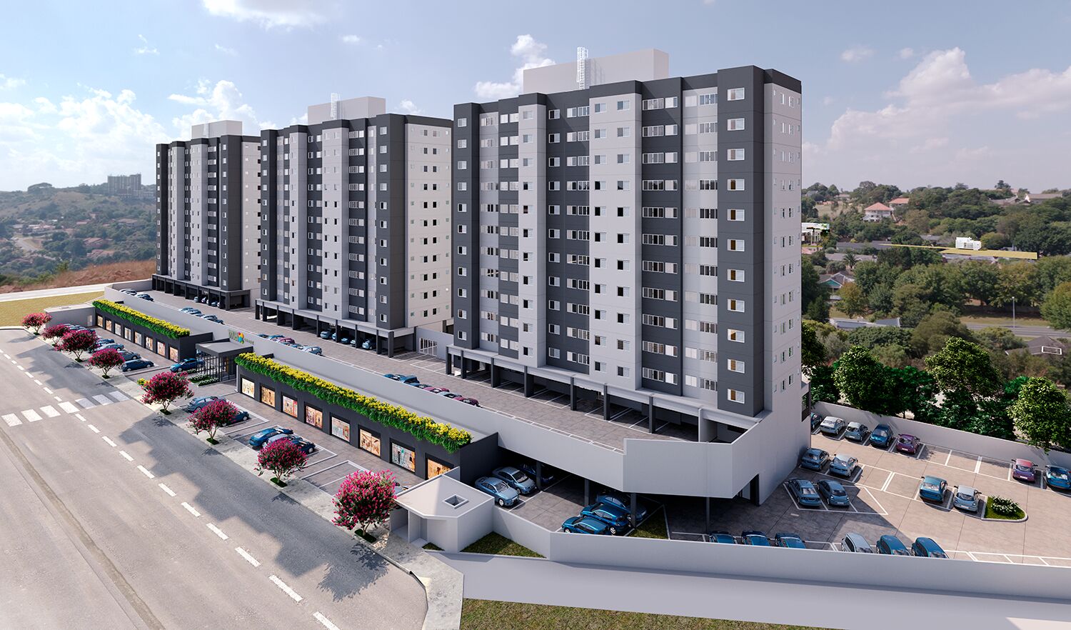 Localizado dentro do Condomínio Cidade, o empreendimento unirá o residencial à diversas empresas, compondo um ambiente moderno, único e totalmente prático, com uma rede completa para atender as necessidades básicas em um único lugar.