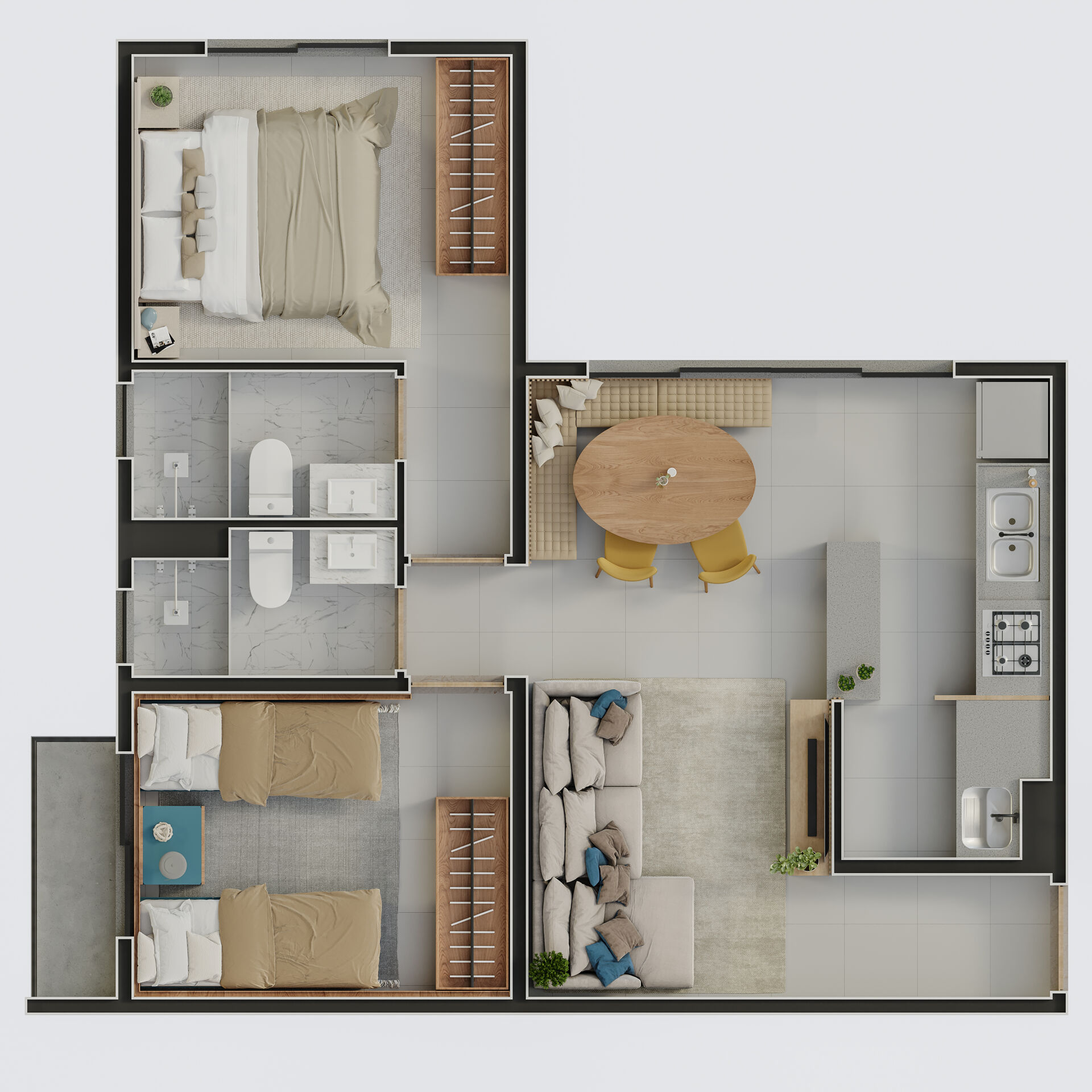 Apartamento na planta com 2 quartos sendo 1 suíte, cozinha, banheiro social, e área de serviço.