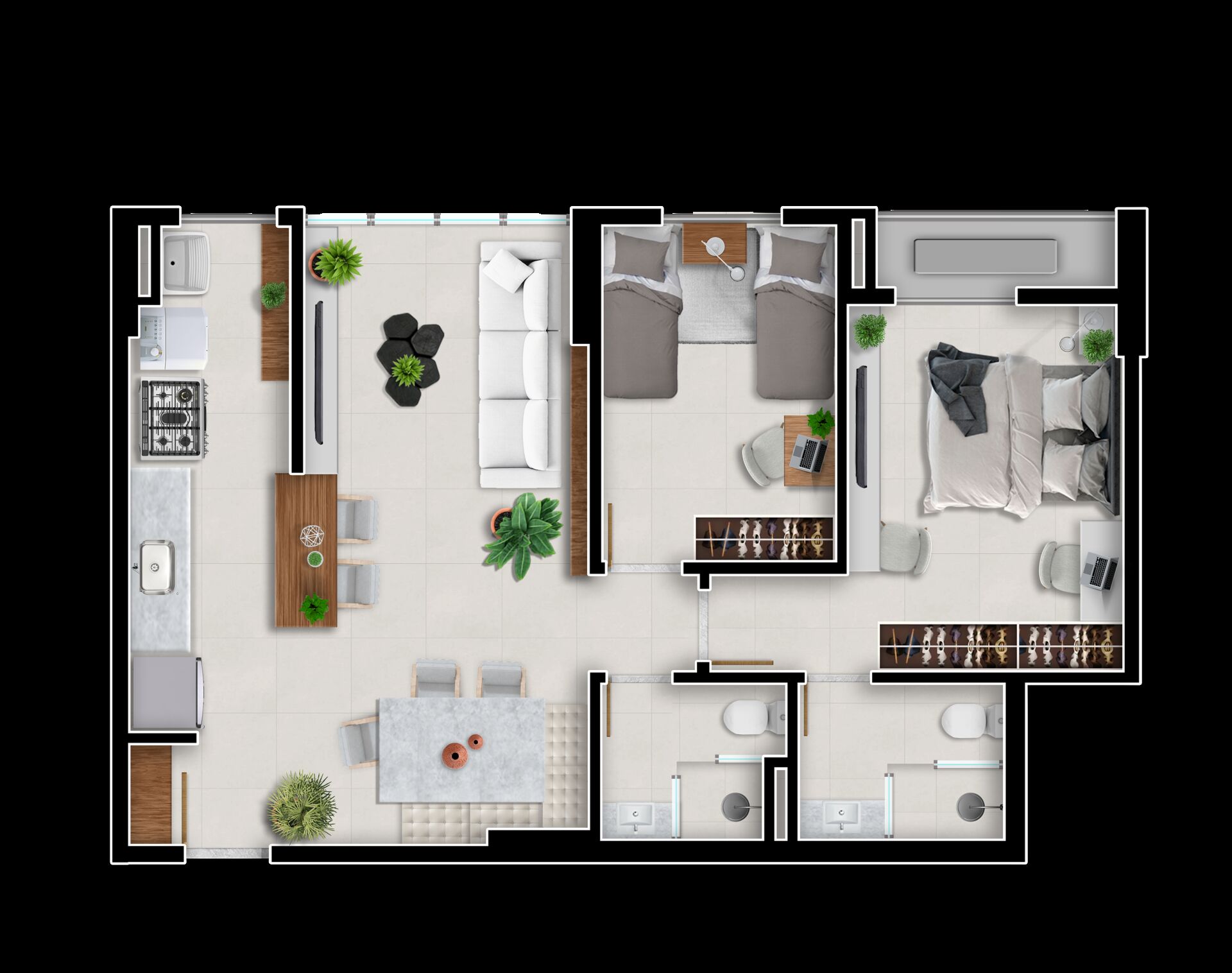 Apartamento na planta com 2 quartos 1 suíte, cozinha, sala de estar e área de serviço.