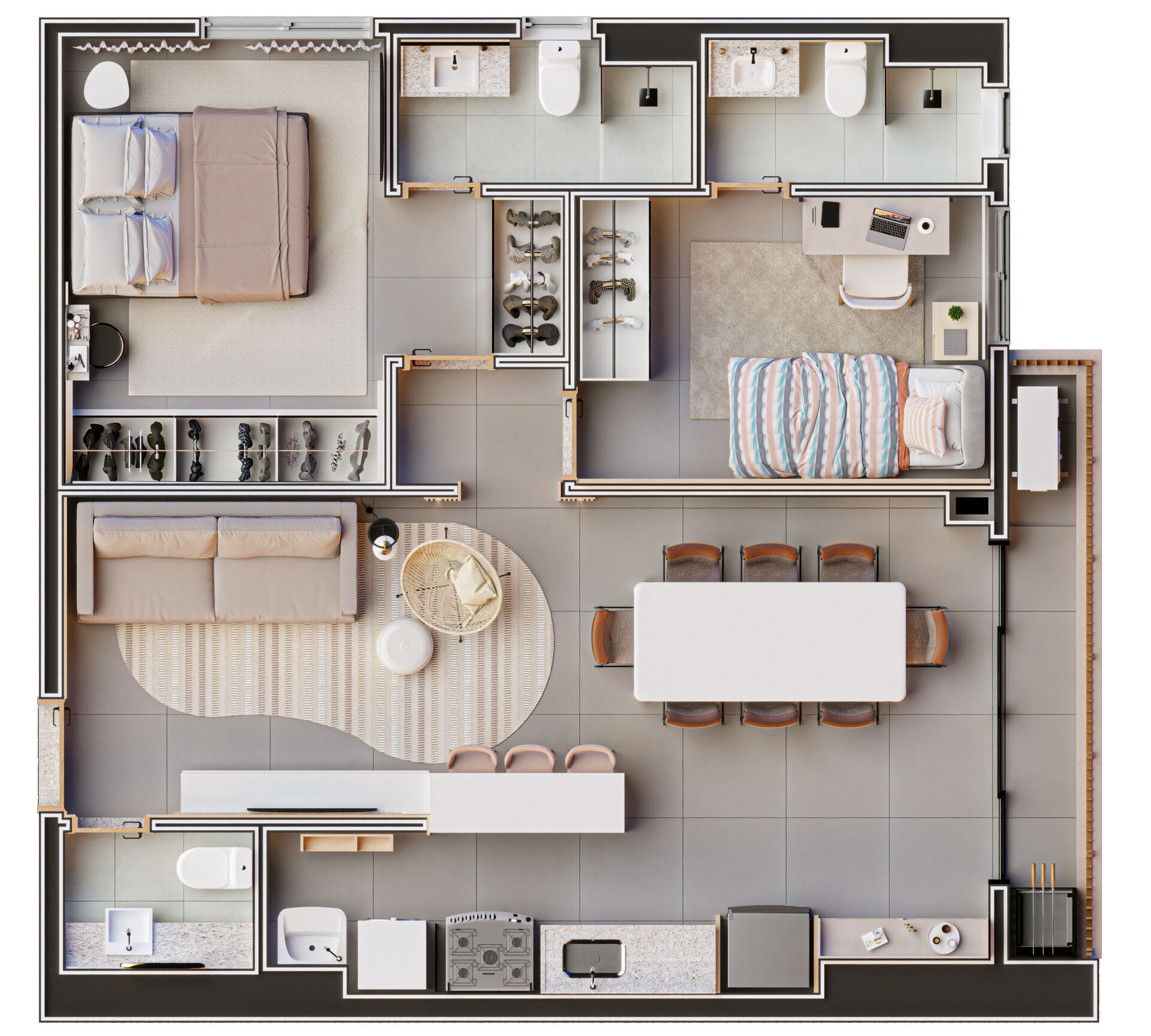 Apartamento na planta com 2 quartos 2 suíte, cozinha, sala de estar, lavabo, área de serviço e varanda gourmet.