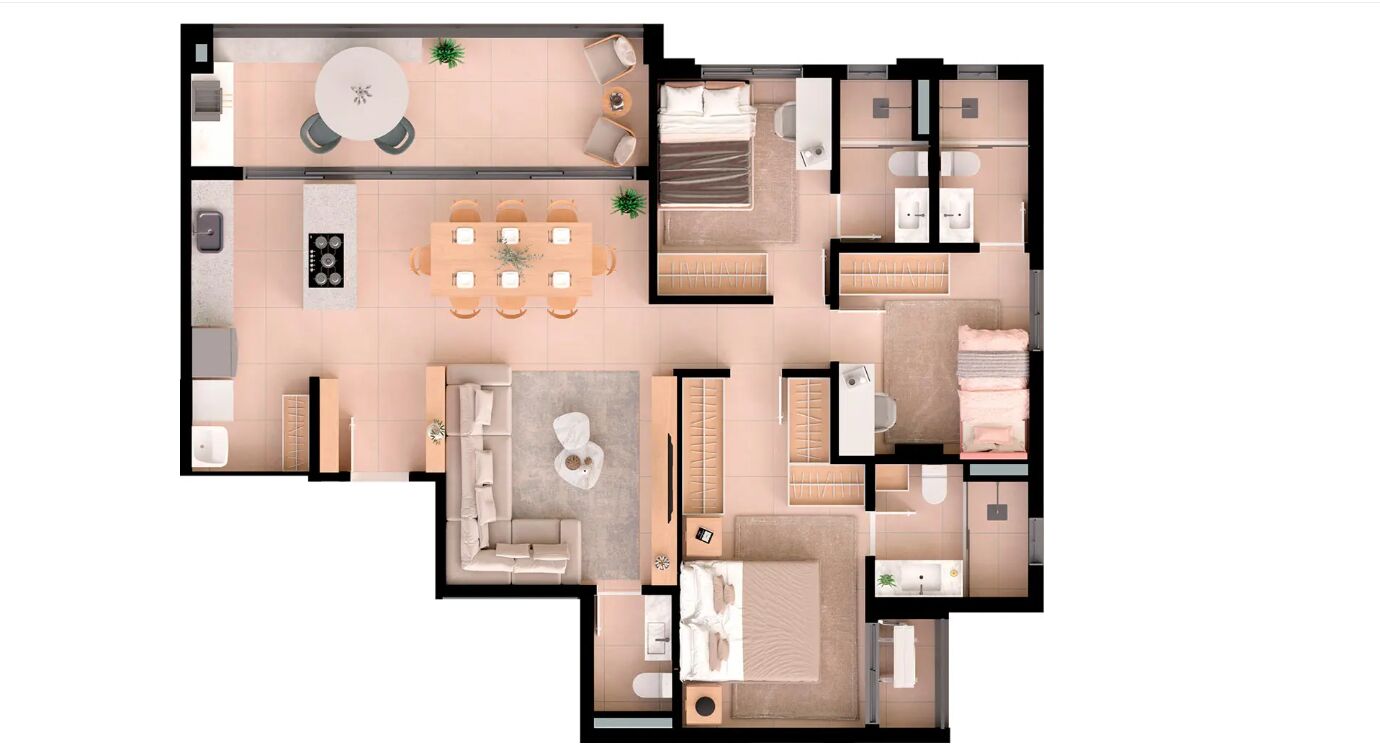 Apartamento na planta com 3 quartos sendo 3 suíte, cozinha, banheiro social, área de serviço e varanda.