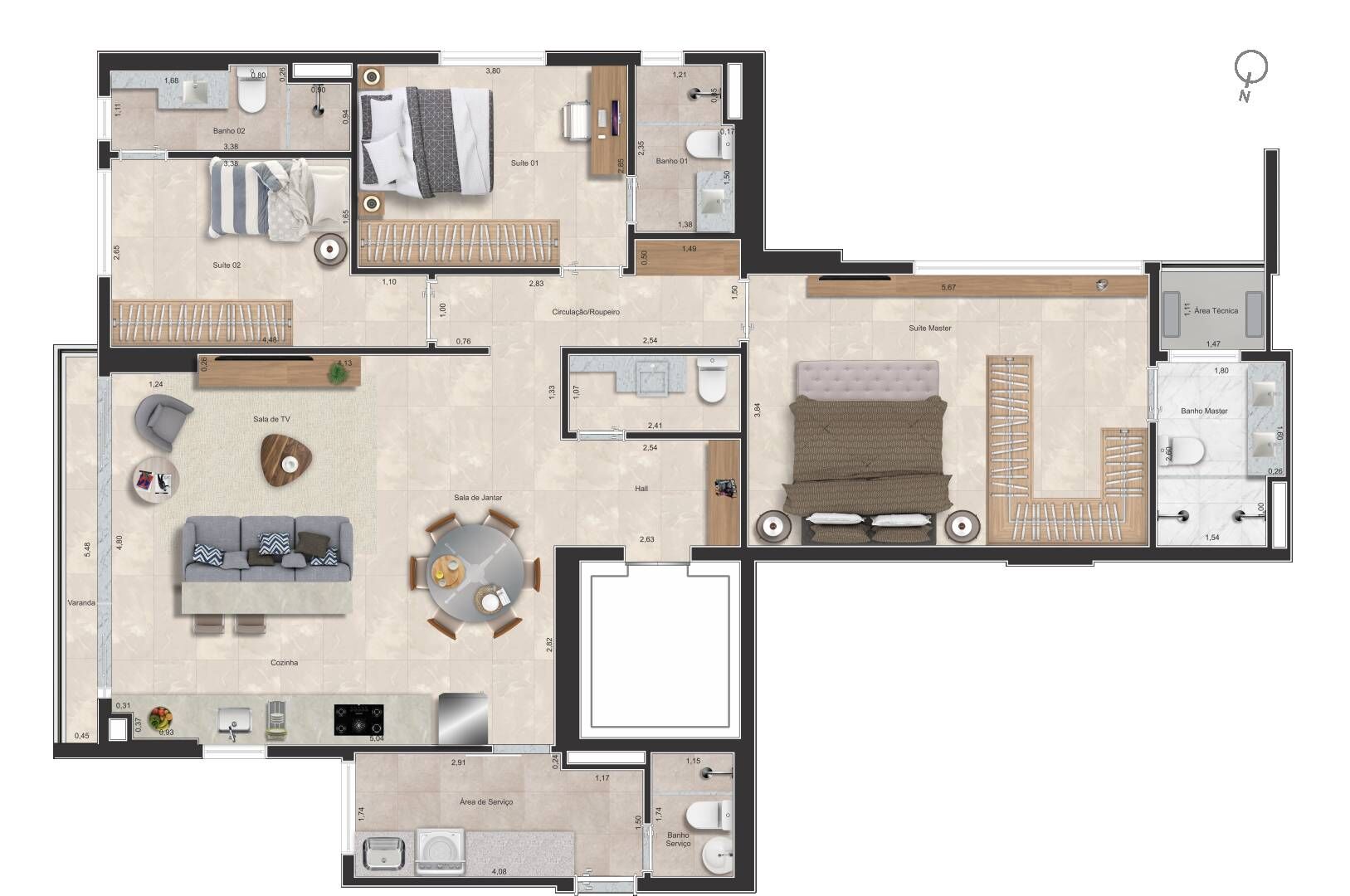 Apartamento na planta com 3 quartos sendo 3 suíte, cozinha, lavabo, banheiro de serviço, área de serviço e varanda.