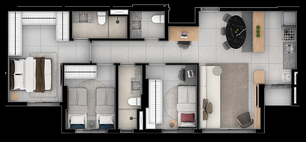 Apartamento na planta com 3 quartos sendo 1 suíte, cozinha, lavabo, área de serviço.