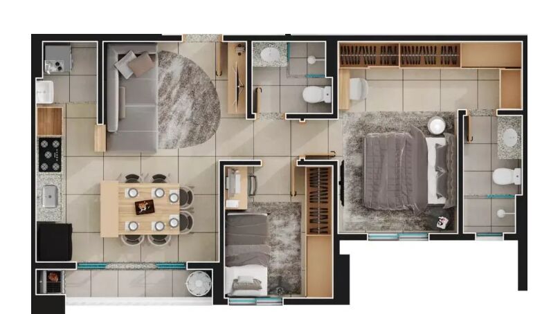 Apartamento na planta com 2 quartos sendo 1 suíte, cozinha, banheiro social, área de serviço e varanda.