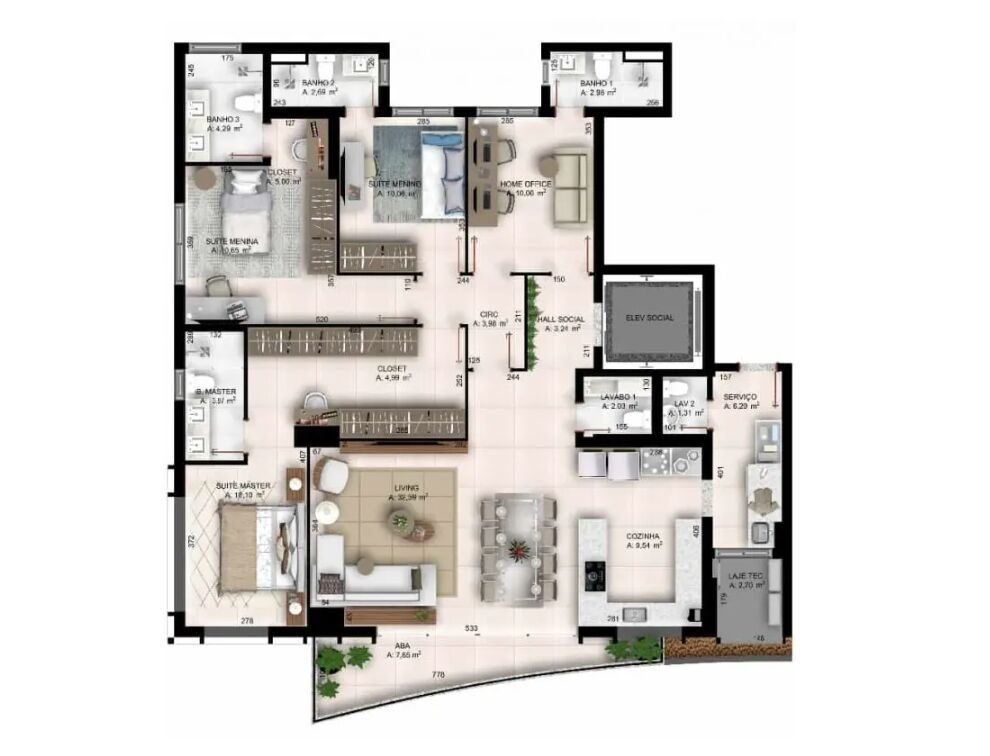 Apartamento na planta com 4 quartos sendo 4 suíte, cozinha, dois lavabos, área de serviço e varanda.