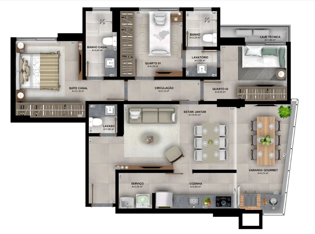 Apartamento na planta com 3 quartos sendo 3 suíte, cozinha, lavabo, área de serviço e varanda gourmet.