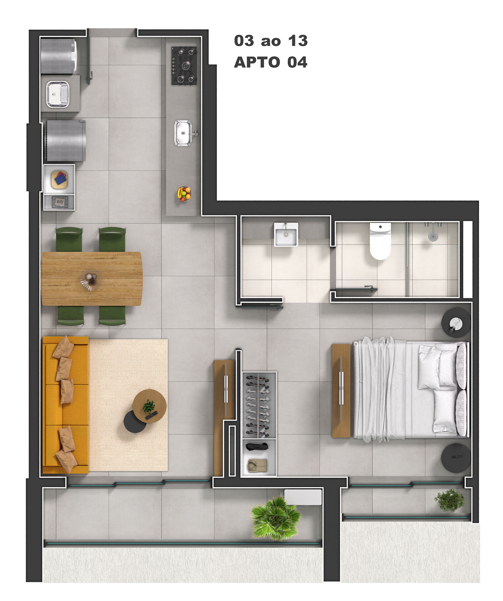 Apartamento na planta com 1 quartos com varanda, cozinha, banheiro social, área de serviço.
