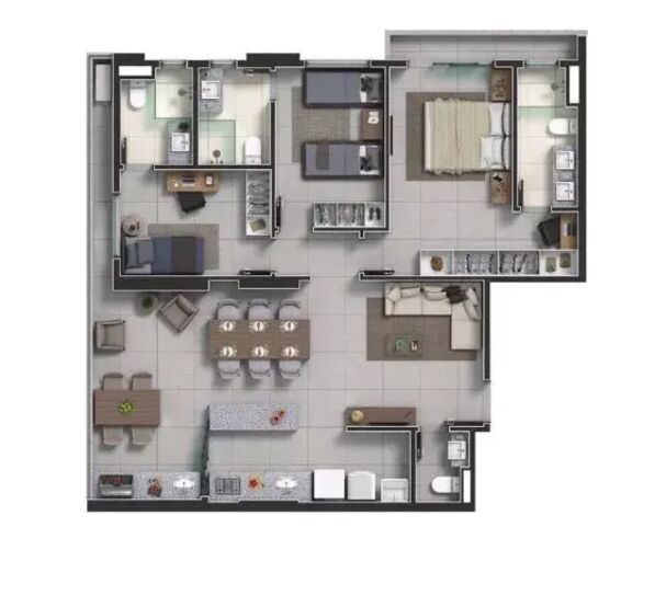 Apartamento na planta com 3 quartos sendo 3 suíte, cozinha, lavabo, área de serviço e varanda.