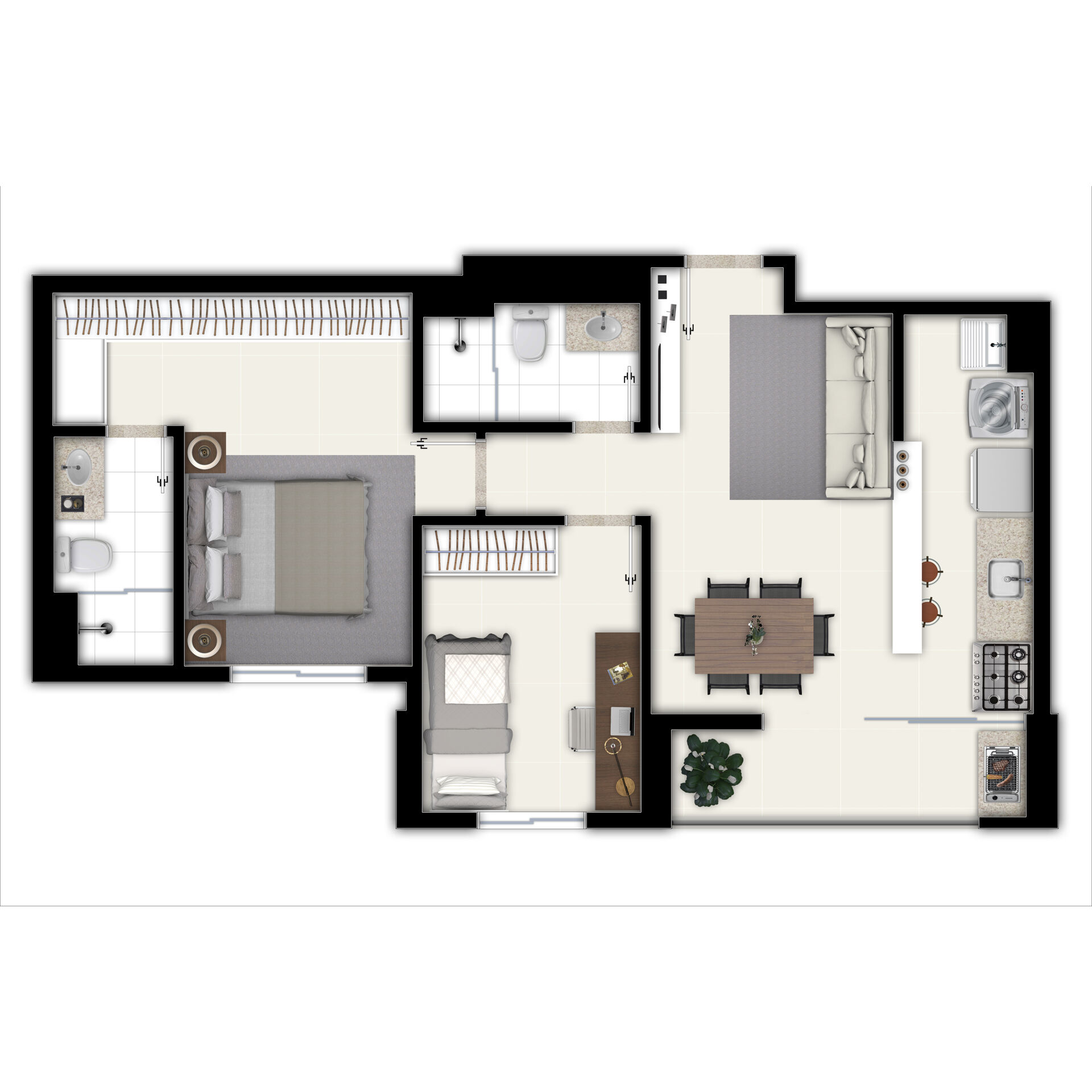 Apartamento na planta com 2 quartos sendo 1 suíte, cozinha, banheiro social, área de serviço e varanda.
