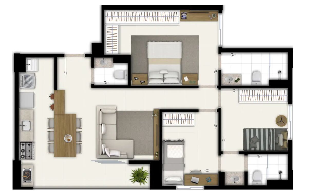 Apartamento na planta com 3 quartos sendo 3 suíte, cozinha, lavabo, área de serviço e varanda.