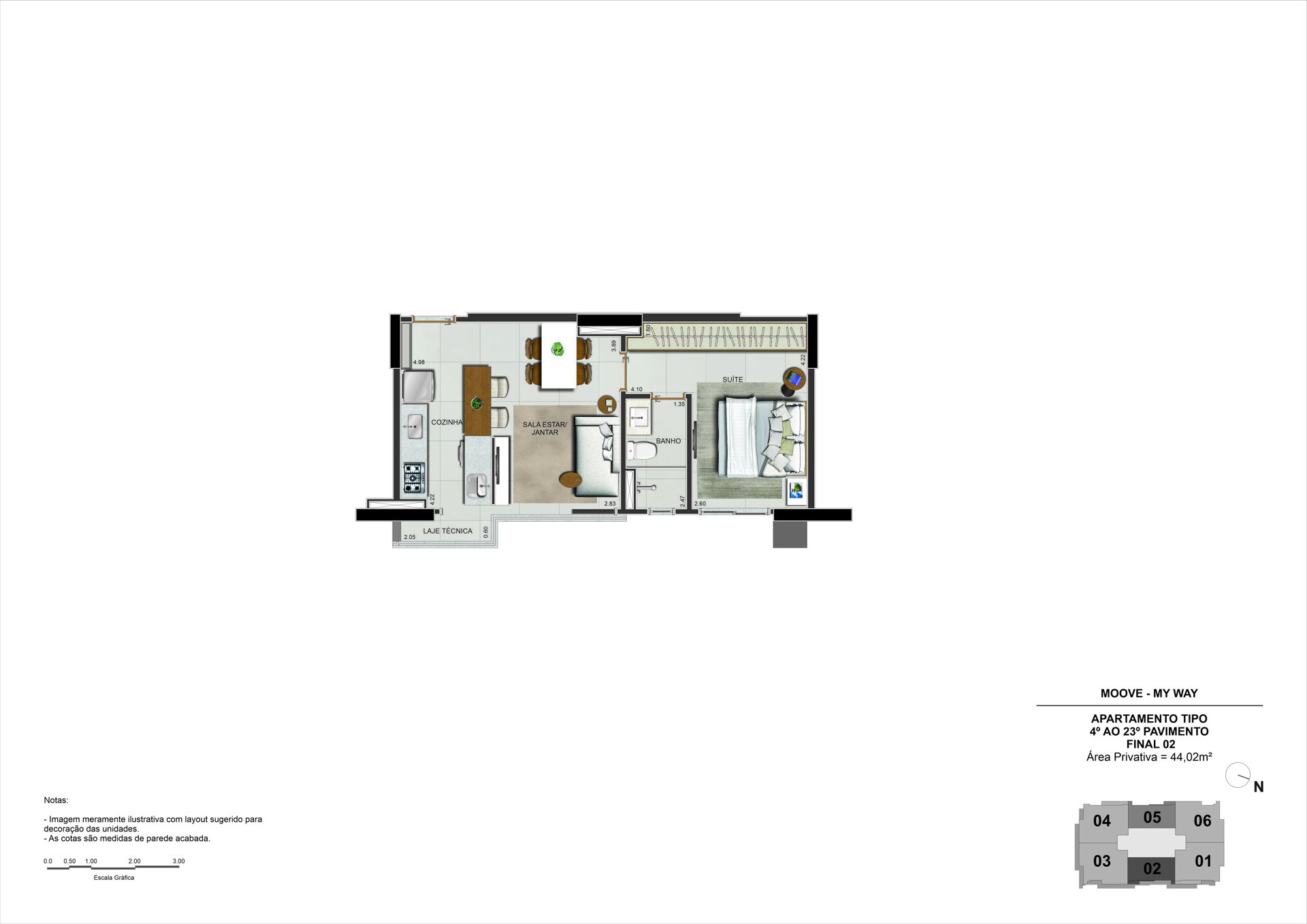 Apartamento na planta com 1 suíte, cozinha, área de serviço e laje técnica.
