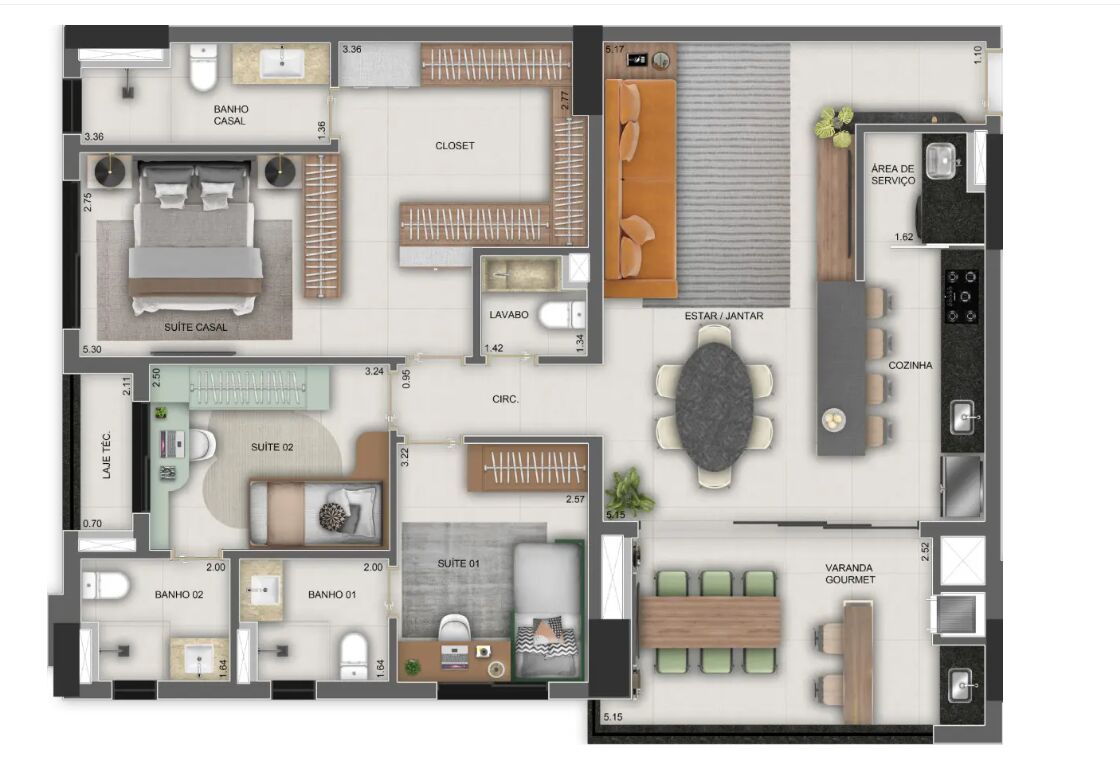 Apartamento na planta com 3 quartos sendo 3 suíte, cozinha, lavabo, área de serviço e varanda gourmet com churrasqueira a carvão. Os apartamentos do Closer23 têm 2 a 3 quartos, com 6 tipos de plantas de 65 a 147 m² privativos. Todas as unidades serão entregues com varanda gourmet rebaixo em gesso, janelas com persianas nas suítes, espera para ar condicionado nas áreas sociais e íntimas, além de fechadura digital.