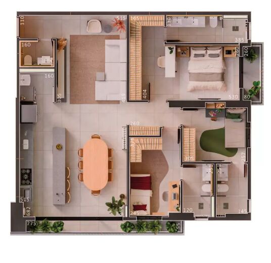 Apartamento na planta com 3 quartos sendo 3 suíte, cozinha, lavabo, área de serviço e varanda balcão.