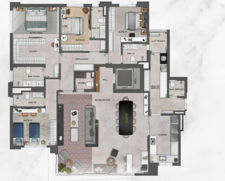 Em termos de áreas de lazer, o empreendimento conta com espaços que somam 1.700m² distribuídos em dois pavimentos. As opções incluem lounge gourmet, salão de festas, piscina, solarium bar, quadra recreativa e espaço wellness.