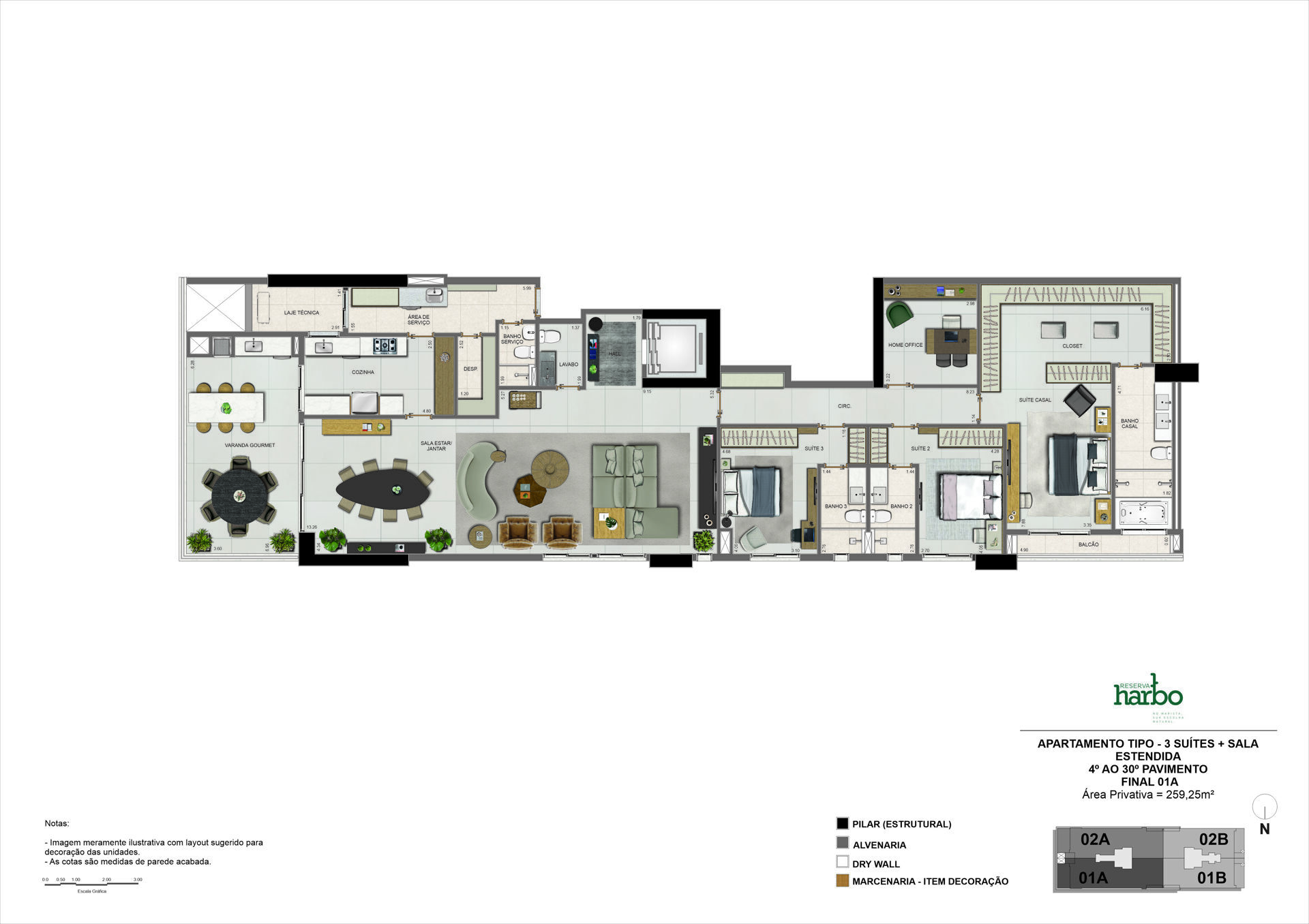 Apartamento alto padrão composto por: Hall de elevador social privativo, sala de estar/jantar, lavabo, varanda gourmet, circulação, 4 suítes sendo 1 suíte master com closet estendido, balcão, cozinha, área de serviço, banho de serviço e laje técnica.