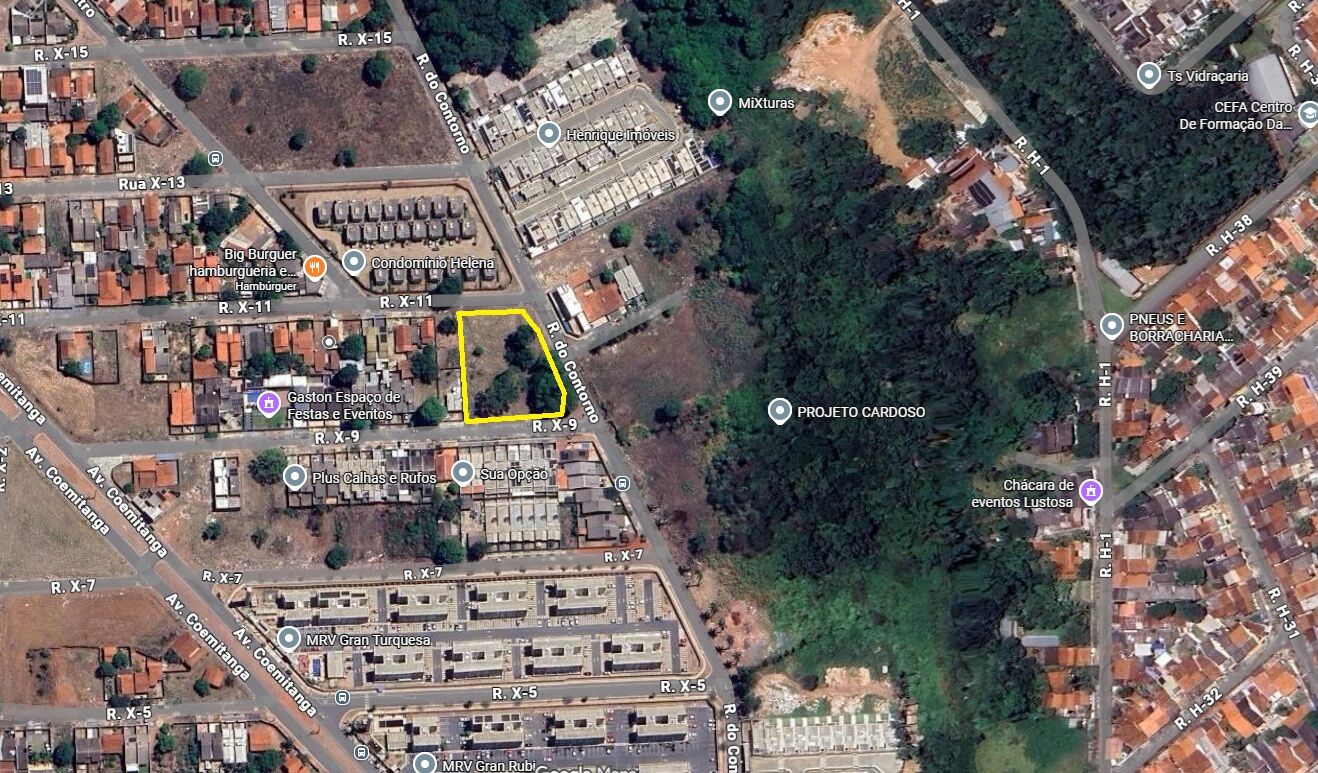 Excelente área de cabeça de quadra, com área total de 3.160,87 m², localizada na Rua X-11 com a Rua X-09 e Rua Contorno, no Bairro Cardoso, em Aparecida de Goiânia, nas proximidades do Jardins Mônaco, Avenida Rio Verde e Anel Viário.