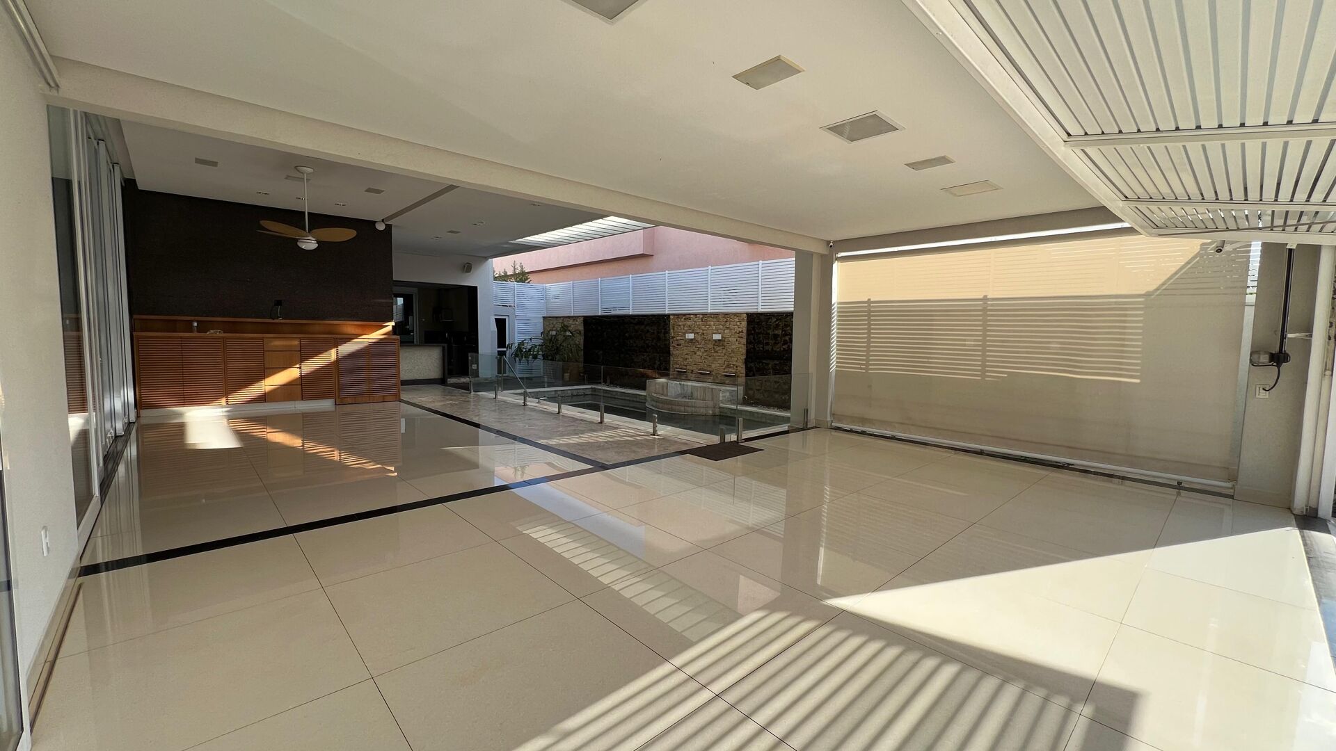 Sala ampla com três ambientes e pé-direito duplo, home cinema, cozinha gourmet integrada à área externa com churrasqueira a carvão, ideal para receber com elegância. Acabamentos de altíssimo padrão em mármore, granito e porcelanato, metais nobres, piscina aquecida com hidromassagem e dependência completa de serviço.