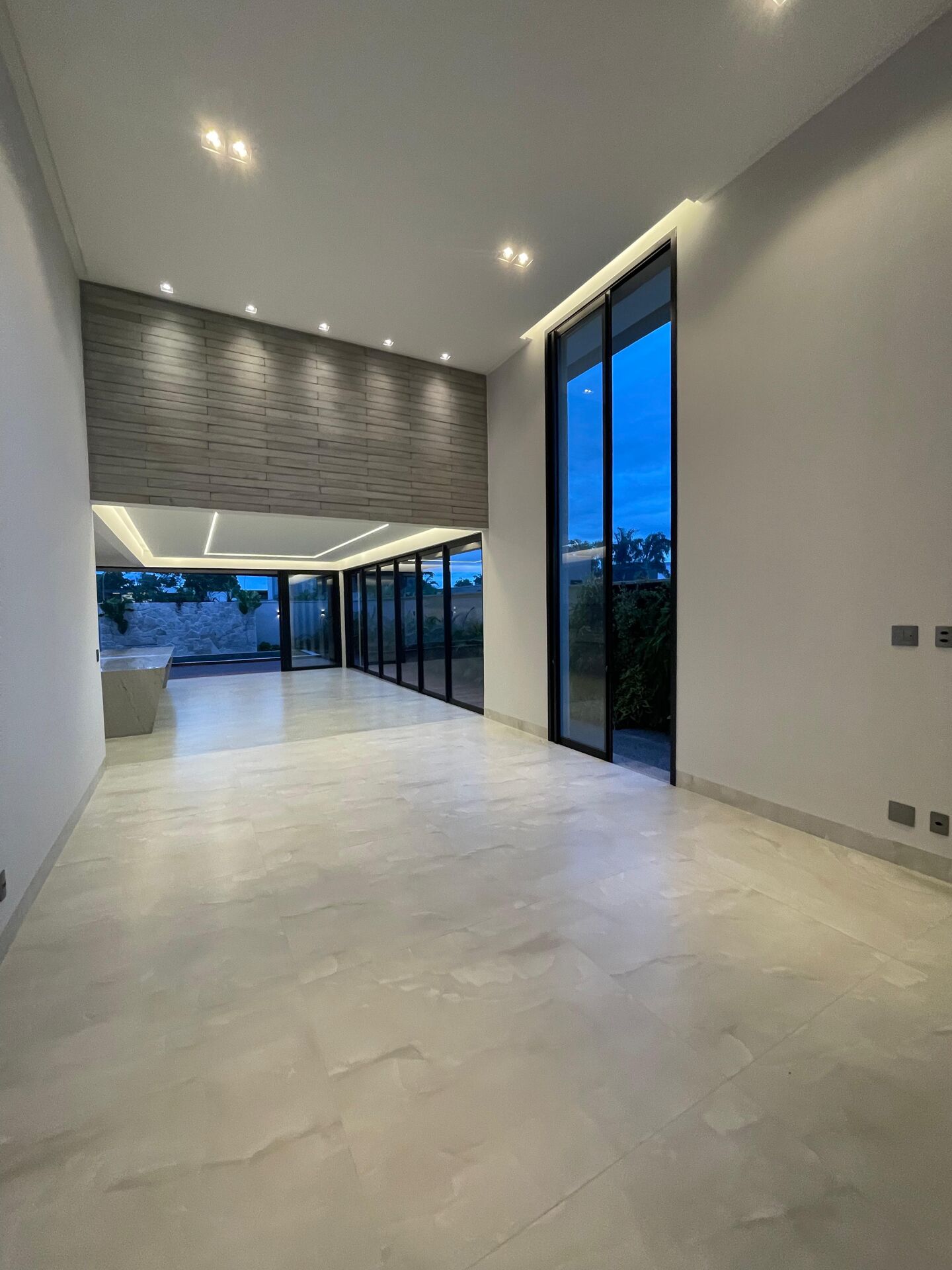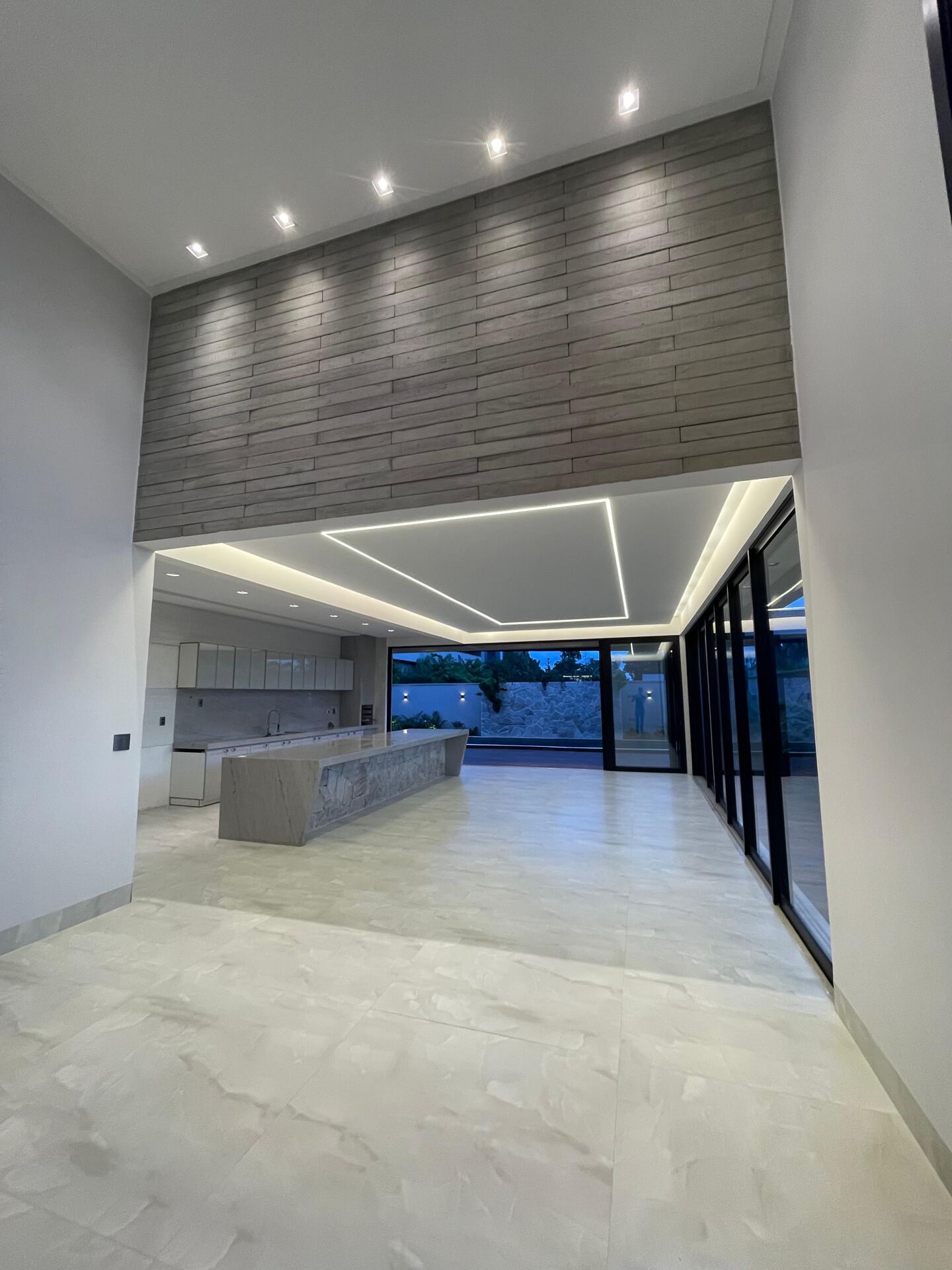 >Fachada toda em Vigas protendidas , pedras naturais, ripados, fugê, porta de 6 metros c/ fechaduras eletrônica e uma impressionante iluminação em Led.